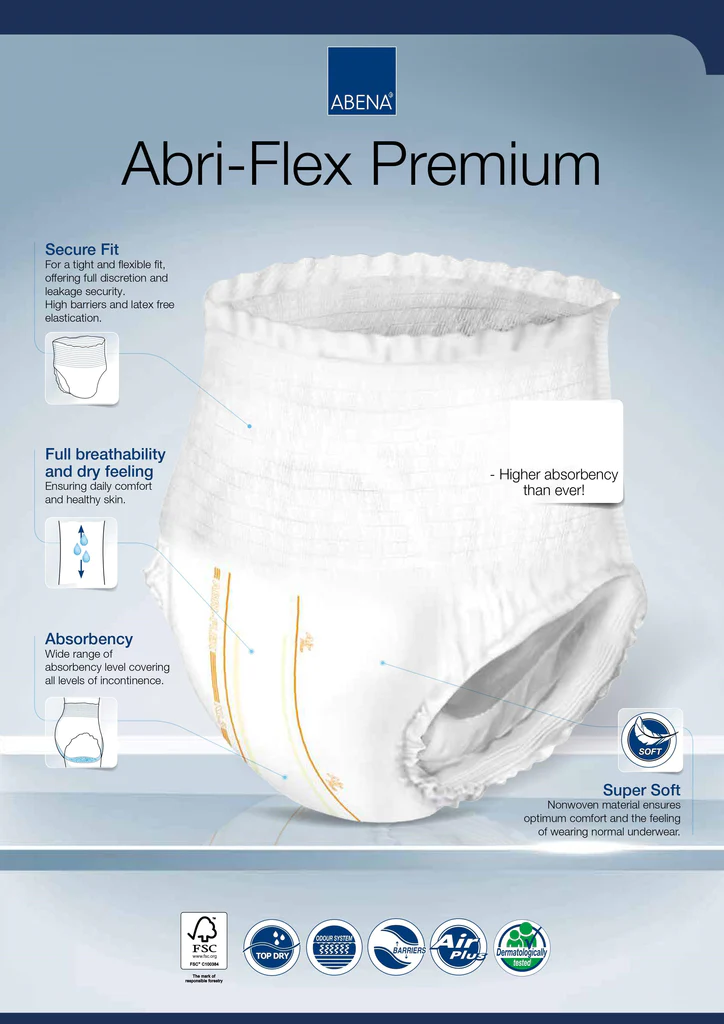 کمپانی معتبر ابنا (ABENA) تولیدکننده پوشک و پوشینه شورتی, شورت یکبار مصرف بی اختیاری ادرار بزرگسالان ابری فلکسABRI-FLEX کشور دانمارک است.